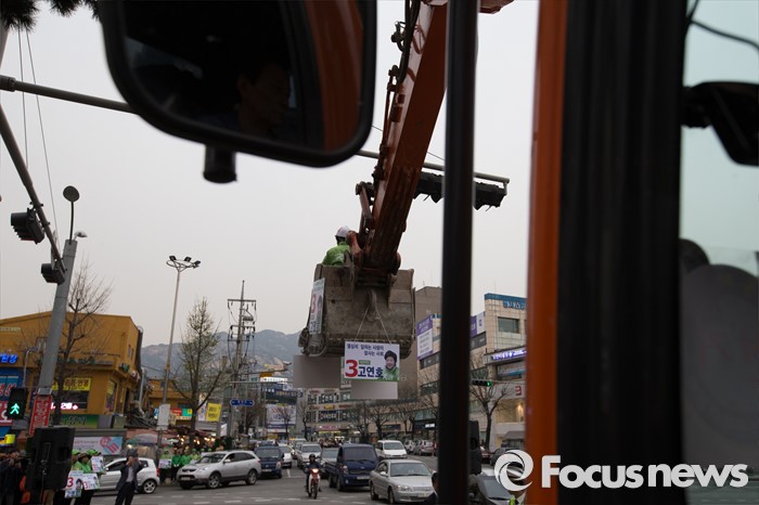 (서울=포커스뉴스) 6일 오후 서울 은평구 연신내 물빛공원에서 고연호 국민의당 은평구을 후보가 포클레인 위에서 유세를 하고 있다.