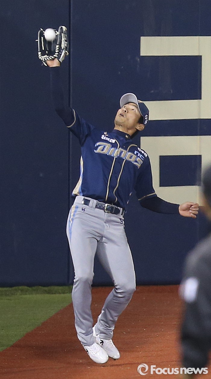 (서울=포커스뉴스) 6일 서울 잠실구장에서 열린 2016 프로야구 NC-두산 경기 4회말 NC 좌익수 김종호가 인쪽 펜스 근처에서 두산 양의지의 파울 타구를 잡고 있다.