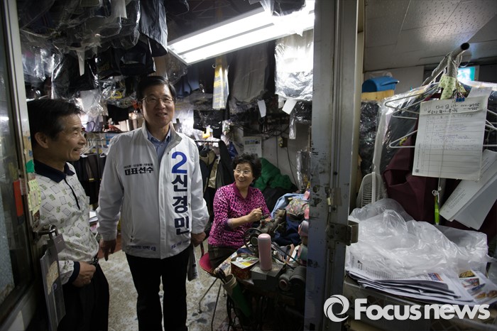 (서울=포커스뉴스) 6일 오후 서울 영등포구 한양아파트 사거리 일대에서 신경민 더불어민주당 영등포구을 후보자가 유세를 하고 있다.