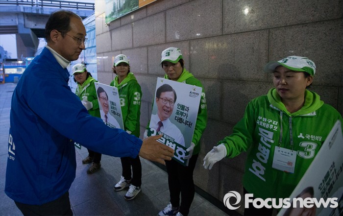(인천=포커스뉴스) 제20대 총선에 출마한 이성만 더불어민주당 부평갑 후보가 6일 오후 인천 부평구 부개역 인근에서 문병호 국민의당 후보 선거운동원들과 악수하고 있다.