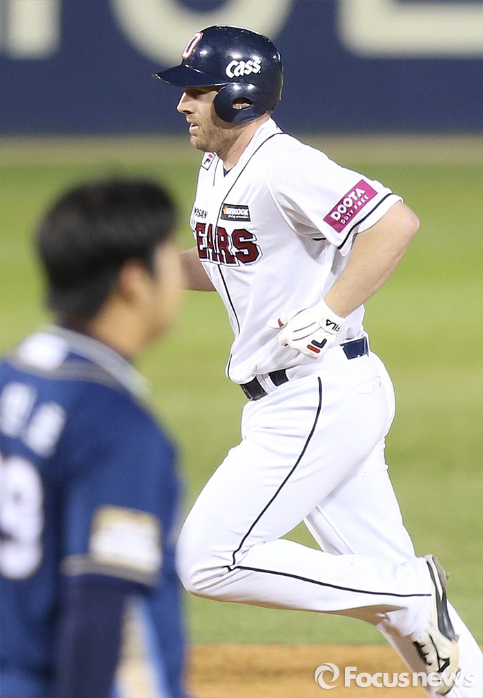 (서울=포커스뉴스) 6일 서울 잠실구장에서 열린 2016 프로야구 NC-두산 경기 6회말 1사후 두산 에반스가 우월 1점 홈런을 치고 베이스를 돌고 있다.