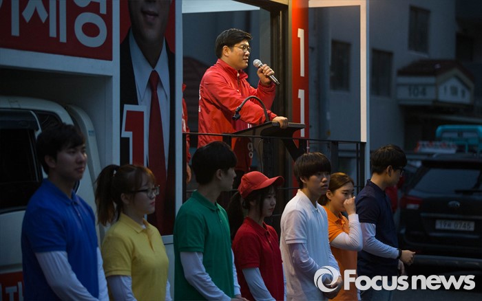 (서울=포커스뉴스) 6일 오후 서울 강동구 천호동 인근의 한 아파트 앞에서 이재영 새누리당 후보가 유세를 펼치고 있다.