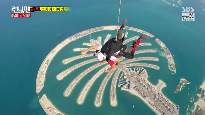 한편 두바이 관광청의2015년 전체 숙박객 수는 2014년 대비 7.5% 성장한 1420만명으로 집계됐다. 이는 이는 UN 세계 여행 기구(UNWTO)가 밝힌 동기간 성장률 3~4%의 두 배를 상회한 수치다.지난달 방송된 SBS 예능프로그램 '런닝맨-두바이편'에서 스카이다이빙을 하는 모습.<사진출처=SBS>