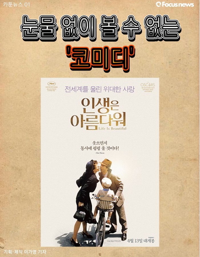 (서울=포커스뉴스) 칸과 아카데미를 휩쓸었던 영화 ‘인생은 아름다워’가 19년 만에 재개봉합니다. 이 영화를 직접 극장에서 봐야만 하는 이유는 무엇일까요? 카툰뉴스로 이 영화 매력을 조금 먼저 느껴보시죠.