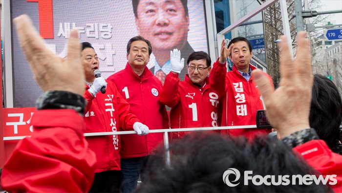 (서울=포커스뉴스) 7일 오전 서울 강서구 화곡역 사거리에서 강서구갑ㆍ을ㆍ병 후보 합동 지원유세에 나선 김무성(왼쪽 두번째) 새누리당 대표가 후보들과 함께 유권자들에게 지지를 호소하고 있다.