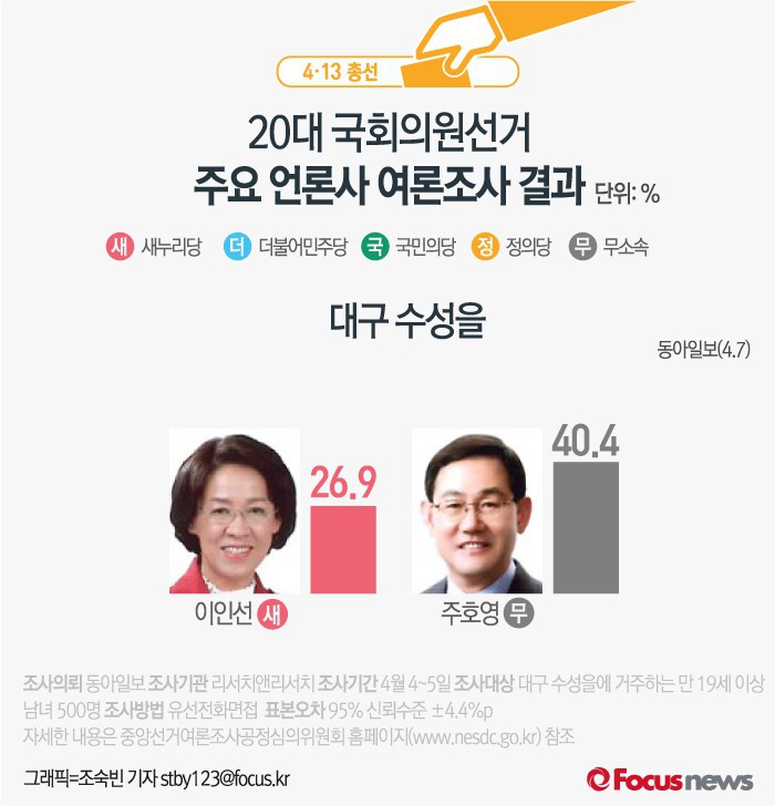 (서울=포커스뉴스) 동아일보가 여론조사기관 리서치앤리서치에 의뢰해 7일 발표한 결과에 따르면 대구 수성을에서 새누리당 이인선 후보의 지지율은 26.9%, 무소속 주호영 후보의 지지율은 40.4%인 것으로 나타났다.