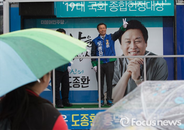 (청주=포커스뉴스) 7일 오전 충북 청주시 흥덕구 복대사거리에서 도종환 더불어민주당 후보가 출근길 시민들에게 인사를 하며 지지를 호소하고 있다.