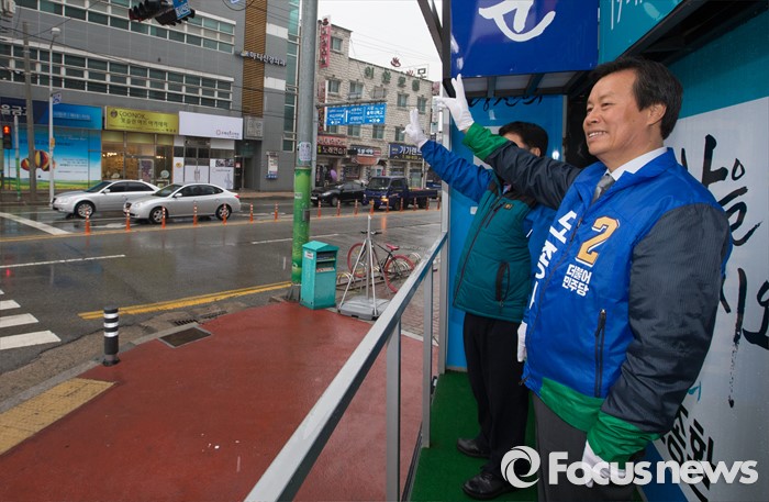 (청주=포커스뉴스) 7일 오전 충북 청주시 흥덕구 복대사거리에서 도종환 더불어민주당 후보가 출근길 시민들에게 인사를 하며 지지를 호소하고 있다.