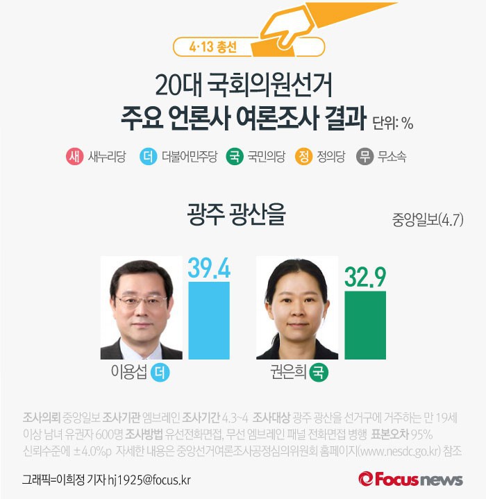이번 중앙일보 여론조사는 3~4일 광주 광산을에 거주하는 만 19세 이상 남녀 600명을 대상 유선전화접조사 방식으로 진행됐다. 표본오차는 95% 신뢰 수준에 ±4.0%p다.