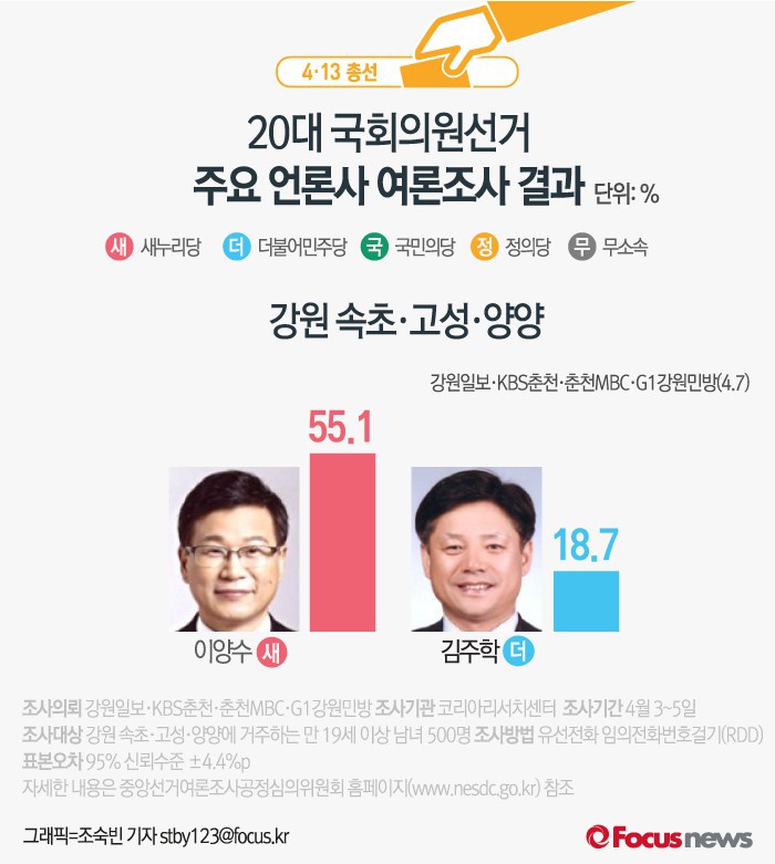 (서울=포커스뉴스) 강원일보·KBS춘천·춘천MBC·G1강원민방이 공동으로 여론조사기관 코리아리서치에 의뢰해 7일 발표한 자료에 따르면 강원 속초·고성·양양에서 새누리당 이양수 후보의 지지율은 55.1%, 더민주 김주학 후보의 지지율은 18.7%로 큰 격차를 보이는 것으로 나타났다.