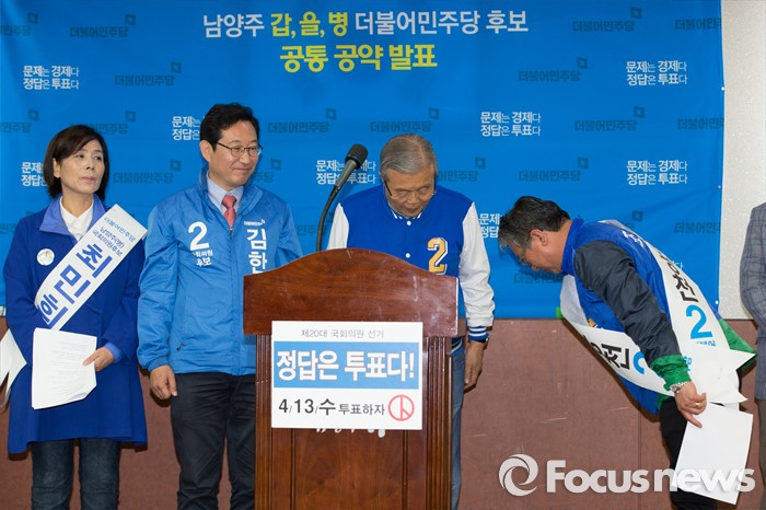 (남양주=포커스뉴스) 7일 오전 경기도 남양주시청에서 공동정책 공약 발표에 앞서 조응천 더불어민주당 남양주갑 후보가 김종인 더불어민주당 비대위 대표를 비롯한 후보들에게 인사를 하고 있다.