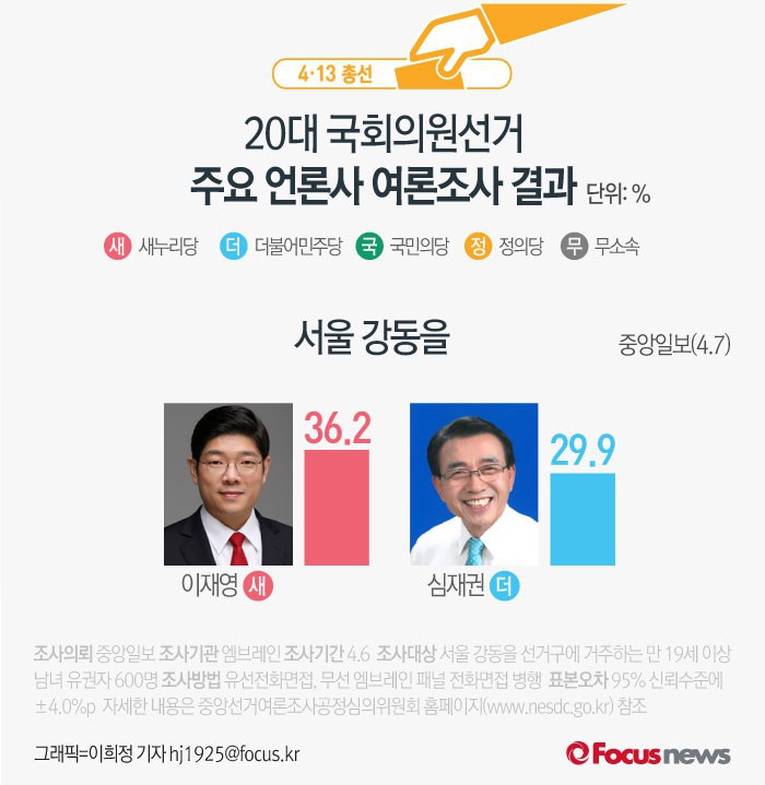 (서울=포커스뉴스) 중앙일보가 엠브레인에 의뢰해 7일 발표한 서울 강동을 여론조사 결과에 따르면 새누리당 이재영 후보의 지지율은 36.2%, 더불어민주당 심재권 후보의 지지율은 29.9%로 나타났다.