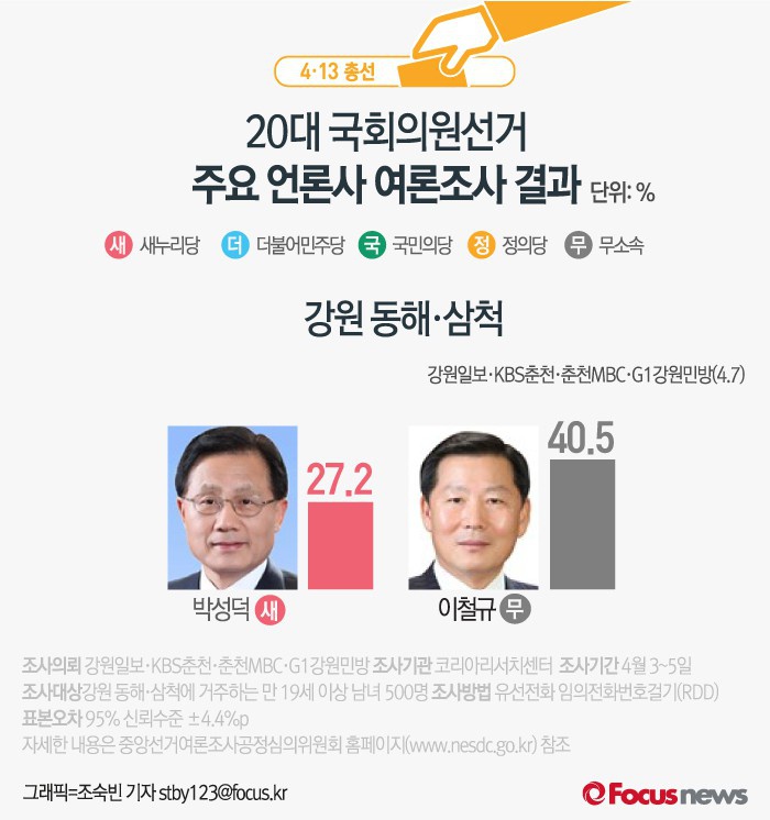 (서울=포커스뉴스) 강원일보·KBS춘천·춘천MBC·G1강원민방이 공동으로 여론조사기관 코리아리서치에 의뢰해 7일 발표한 자료에 따르면 강원 동해·삼척에서 새누리당 박성덕 후보의 지지율은 27.2%, 무소속 이철규 후보의 지지율은 40.5%로 조사됐다.