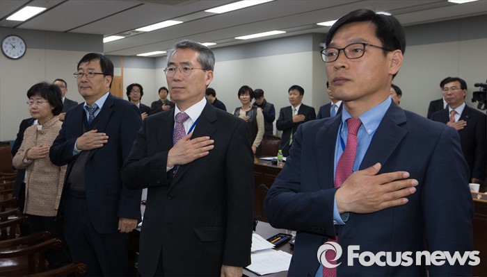 (세종=포커스뉴스) 7일 오전 세종시 정부세종청사 고용노동부 최저임금위원회 대회의실에서 열린 제1차 전원회의에서 박준성 위원장과 위원들이 국기에 대한 경례를 하고 있다.