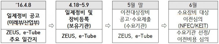 미래부와 산업부는 “연구기관에 방치돼있는 장비들의 재활용이 촉진돼 국가차원에서 연구시설장비의 관리‧활용이 체계화되고, 나아가 국가 연구개발 투자 효율화가 제고될 것”이라고 말했다.유휴장비 이전 추진절차 및 일정.<표제공=미래부>