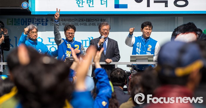 (군포=포커스뉴스) 문재인 더불어민주당 전 대표가 7일 오전 경기도 군포시 산본중심상가를 방문해 유권자들에게 이학영 군포시을 후보, 김정우 군포시갑 후보 지지를 호소 하고 있다.
