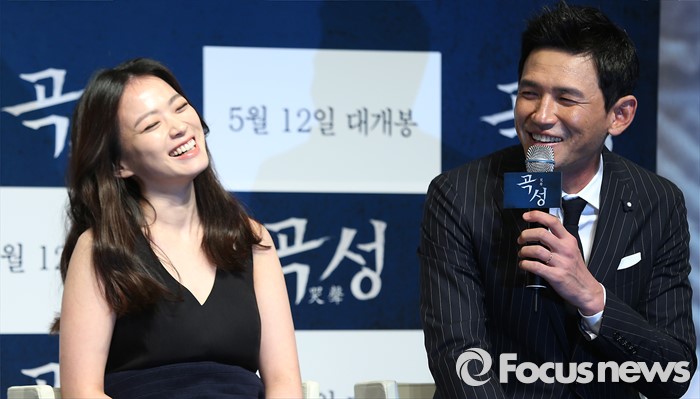 (서울=포커스뉴스) 7일 오전 서울 강남구 압구정CGV에서 열린 영화 '곡성' 제작보고회에 참석한 배우 천우희(왼쪽)와 황정민이 미소를 짓고 있다.