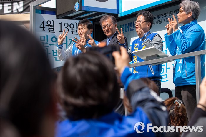 (군포=포커스뉴스) 문재인 더불어민주당 전 대표가 7일 오전 경기도 군포시 산본중심상가를 방문해 이학영 군포시을 후보, 김정우 군포시갑 후보와 함께 유권자들에게 한 표를 호소 하고 있다.