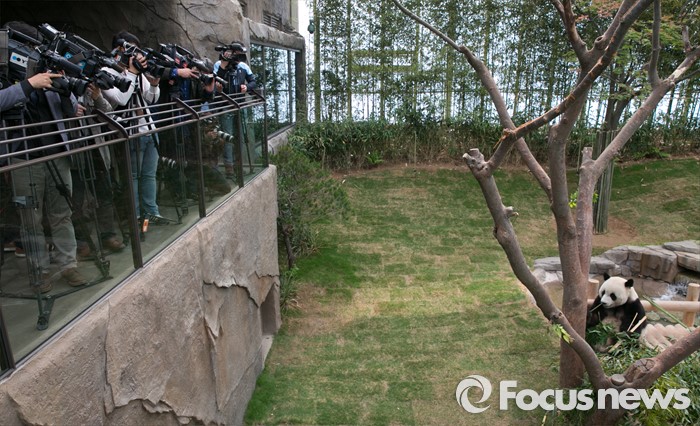(용인=포커스뉴스) 에버랜드가 오는 21일 일반관람객에게 공개를 앞두고 판다월드에서 생활 중인 시진핑 중국 국가주석의 선물 '아이바오(愛寶)'와 '러바오(樂寶)' 판다커플을 7일 언론에 공개했다. 사진은 수컷 판다 러바오의 모습.