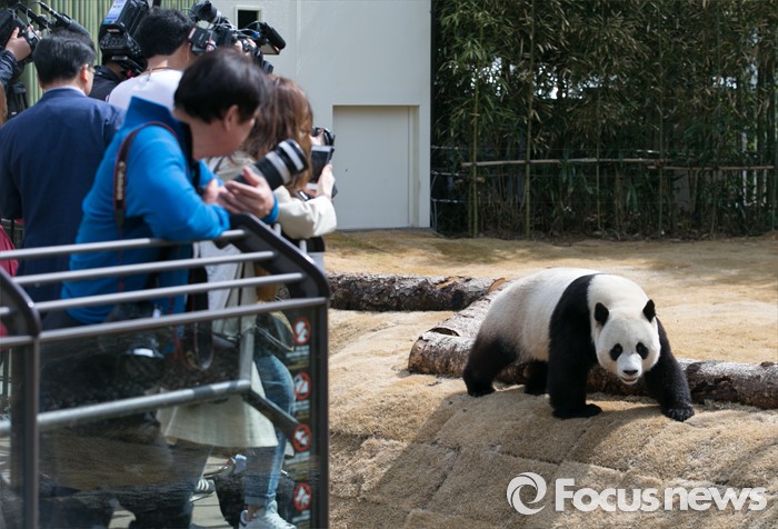 (용인=포커스뉴스) 에버랜드가 오는 21일 일반관람객에게 공개를 앞두고 판다월드에서 생활 중인 시진핑 중국 국가주석의 선물 '아이바오(愛寶)'와 '러바오(樂寶)' 판다커플을 7일 언론에 공개했다. 사진은 수컷 판다 러바오의 모습.