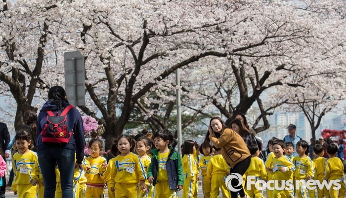 (서울=포커스뉴스) 7일 오전 서울 여의도 윤중로 일대에서 열린 벚꽃축제를 찾은 어린이들이 나들이를 즐기고 있다.