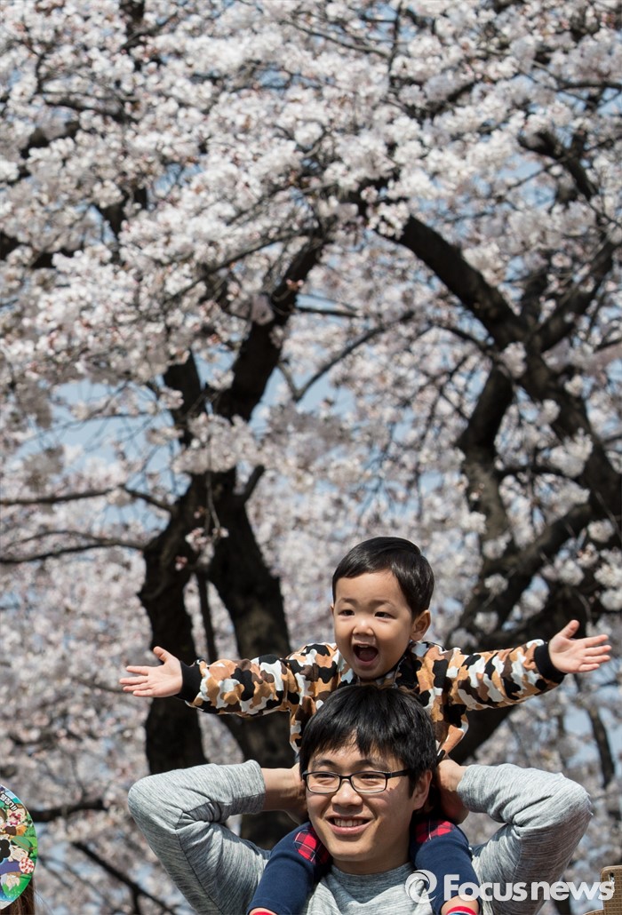 (서울=포커스뉴스) 7일 오전 서울 여의도 윤중로 일대에서 열린 벚꽃축제를 찾은 어린이가 아빠 어깨 위에서 활짝 웃고 있다.