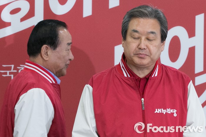 (서울=포커스뉴스) 김무성(오른쪽) 새누리당 대표가 7일 오전 서울 여의도 당사에서 열린 공동선대위원장 긴급회의에 참석해 기다리는 동안, 서청원 최고위원이 김 대표 옆을 지나고 있다.