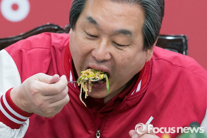 (서울=포커스뉴스) 김무성 새누리당 대표가 7일 오전 서울 여의도 당사에서 열린 공동선대위원장 긴급회의에 참석해, 비빔밥을 먹고 있다.