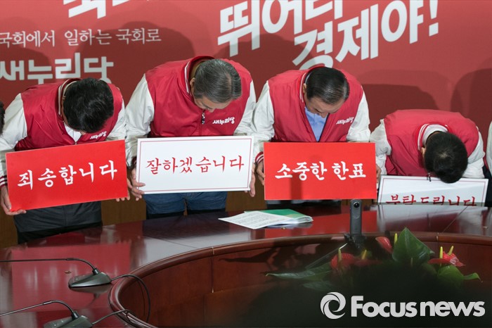 (서울=포커스뉴스) 7일 오전 서울 여의도 새누리당사에서 새누리당 지도부가 공동선대위원장 긴급회의에 참석해, 투표독려 홍보문구를 들고 인사하고 있다. 왼쪽부터 원유철 원내대표, 김무성 대표, 서청원 최고위원, 이군현 공동총괄본부장.