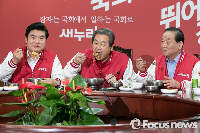 (서울=포커스뉴스) 7일 오전 서울 여의도 새누리당사에서 김무성(가운데) 대표와 원유철(왼쪽) 원내대표, 서청원 최고위원이 공동선대위원장 긴급회의에 참석해, 비빔밥을 먹고 있다.
