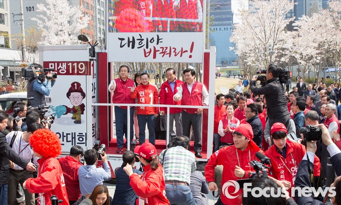 (서울=포커스뉴스) 7일 오후 서울 마포구 늘장공원에서 열린 안대희 새누리당 마포갑 후보 집중유세에 참석한 김무성 대표와 안 후보, 서청원 최고위원, 원유철 원내대표가 유권자들의 지지를 호소하고 있다.