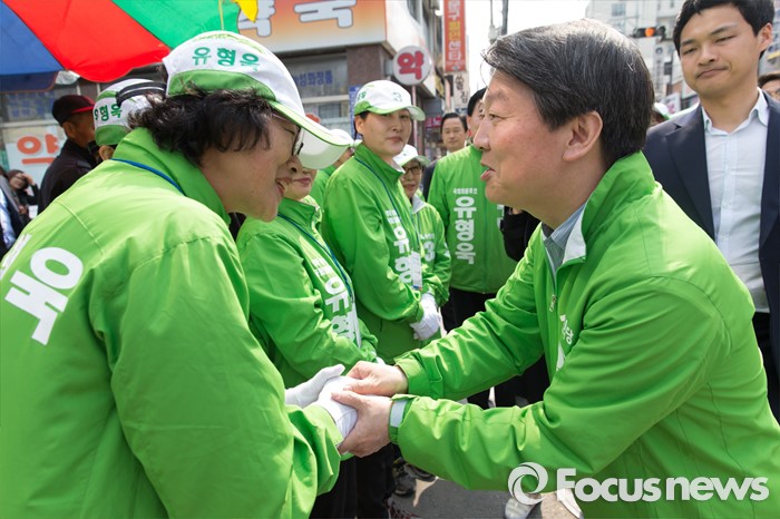 (하남=포커스뉴스) 7일 오후 경기 하남 신장시장 앞에서 안철수 국민의당 상임공동대표가 유형욱 국민의당 하남시 후보 지원유세를 마치고 선거운동원들과 악수를 하고 있다.