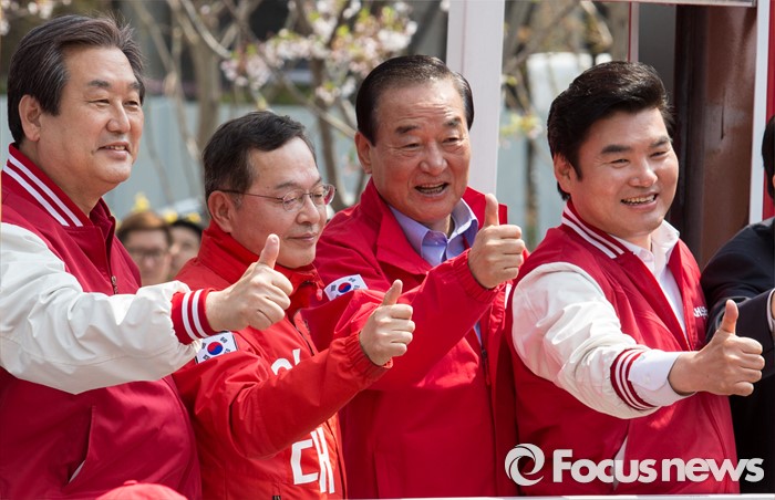 (서울=포커스뉴스) 7일 오후 서울 마포구 늘장공원에서 열린 안대희 새누리당 마포갑 후보 집중유세에 참석한 김무성 대표와 안 후보, 서청원 최고위원, 원유철 원내대표가 유권자들의 지지를 호소하고 있다.