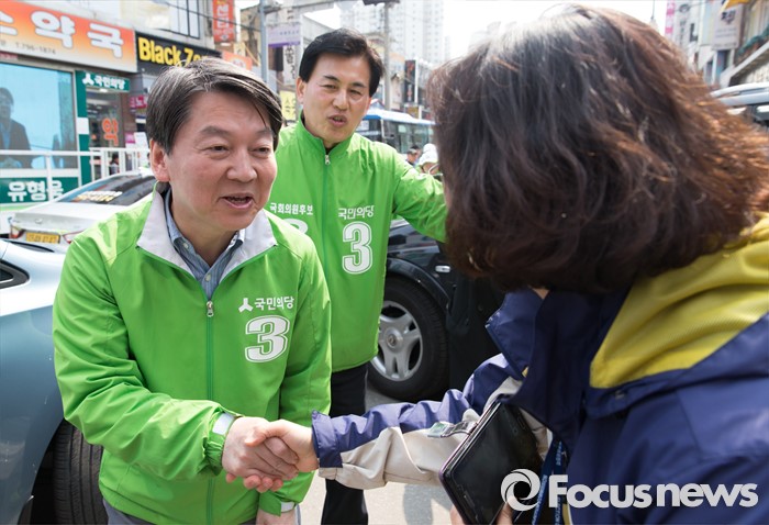 (하남=포커스뉴스) 7일 오후 경기 하남 신장시장 앞에서 안철수 국민의당 상임공동대표가 유형욱 국민의당 하남시 후보 지원유세를 하고 있다.