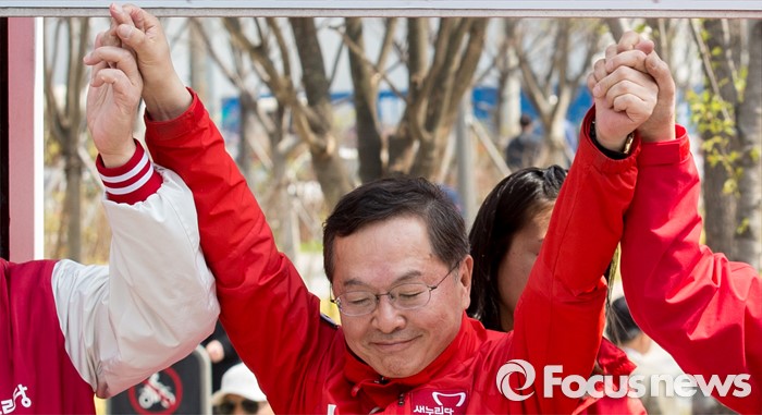 (서울=포커스뉴스) 7일 오후 서울 마포구 늘장공원에서 열린 안대희 새누리당 마포갑 후보 집중유세에 참석한 안 후보가 유권자들의 지지를 호소하고 있다.