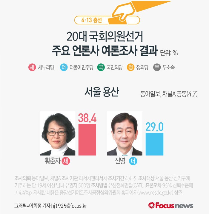 동아일보와 채널A가 여론조사기관 리서치앤리서치 의뢰해 7일 발표한 결과에 따르면 서울 용산에서 후보지지도는 새누리당 황춘자, 더불어민주당 진영, 국민의당 곽태원 후보 순으로 나타났다.