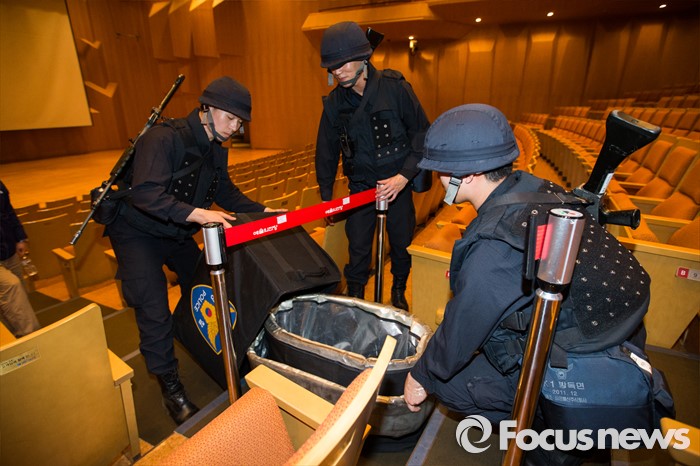 (서울=포커스뉴스) 7일 오후 서울 서초구 예술의전당 음악당에서 열린 유관 기관 합동 대테러훈련에서 경찰들이 폭발 의심물을 처리하고 있다. 이번 훈련은 공연 도중 폭발 의심물체가 발견된 상황을 설정해 훈련을 진행했다.