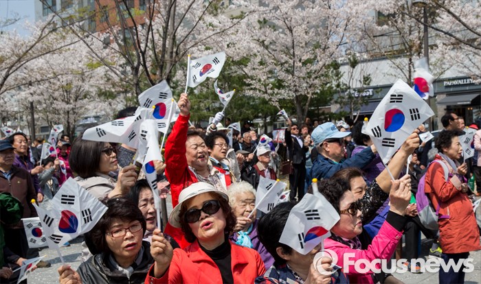 (서울=포커스뉴스) 7일 오후 서울 마포구 늘장공원에서 열린 안대희 새누리당 마포갑 후보 집중유세장에 모인 시민들이 태극기를 흔들며 지지를 보내고 있다.
