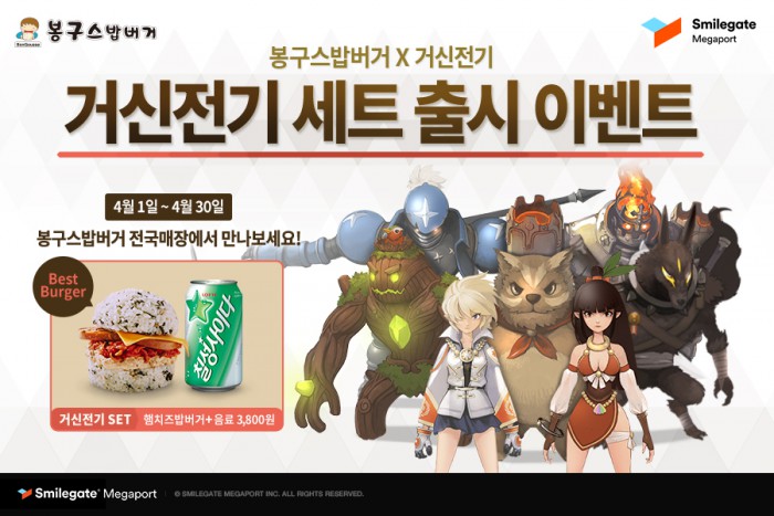 먼저 스마일게이트메가포트(대표 이동훈)는 화제의 모바일게임 '거신전기'(개발사 스노우폴게임즈)에서 주먹밥 프랜차이즈 전문점 봉구스밥버거와 손잡고 공동 프로모션을 오는 30일까지 진행한다. 전국 1000여개에 달하는 봉구스밥버거 매장에서 가장 인기 있는 메뉴인 햄치즈 밥버거와 음료로 구성된 '거신전기 세트' 메뉴를 구입하는 이용자 전원에게 게임 내에서 사용할 수 있는 2만원 상당의 쿠폰을 지급한다.