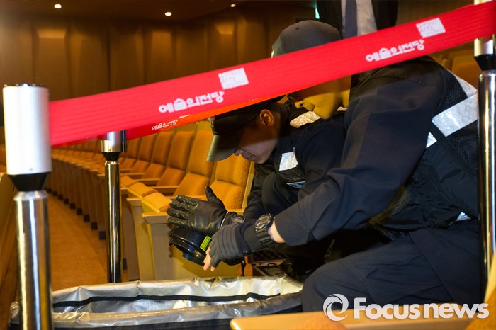 (서울=포커스뉴스) 7일 오후 서울 서초구 예술의전당 음악당에서 열린 유관 기관 합동 대테러훈련에서 경찰들이 폭발 의심물을 처리하고 있다. 이번 훈련은 공연 도중 폭발 의심물체가 발견된 상황을 설정해 훈련을 진행했다.