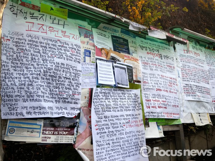이어 "지난 2014년 학생회관이 증·개축되면서 과방, 동아리방, 수면실 등 학생복지시설이 대폭 축소됐다. 현재 사회과학대의 경우 2000여명 학생들이 작은 과방 하나를 같이 쓰는 상황"이라며 "그간 계속해서 학교 측에 학생복지시설을 늘려달라고 요구해왔지만 만족할 만한 답변을 듣지 못했다"고 불만을 토로했다.