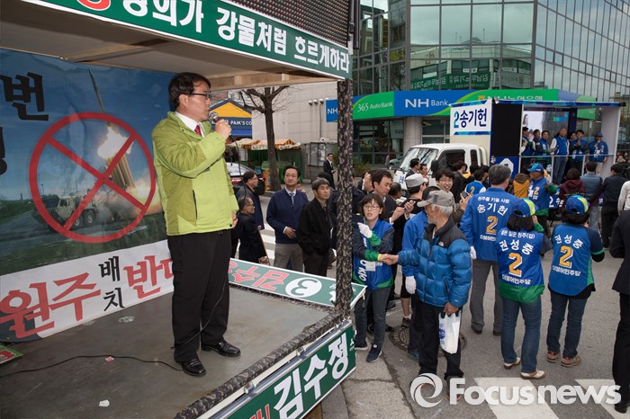 (원주=포커스뉴스) 7일 오후 강원도 원주중앙시장 인근에서 송기헌 더불어민주당 원주을 후보, 김종인 더불어민주당 비대위 대표, 권성중 더불어민주당 원주갑 후보가 유권자들에게 지지를 호소하고 있다.