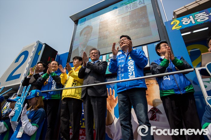 (인천=포커스뉴스) 문재인 더불어민주당 전 대표가 7일 오후 인천광역시 지하철1호선 주안역 남광장에서 더불어민주당 인천광역시 후보 및 인천 남구을 야권단일 정의당 김성진 후보와 합동유세에 앞서 박수 치고 있다.