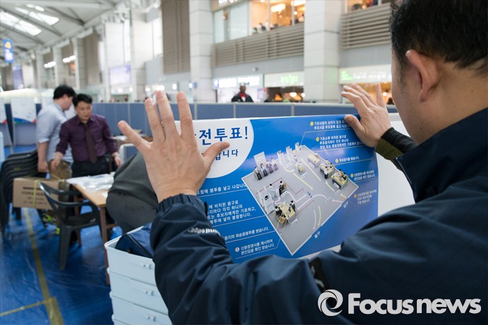 (인천공항=포커스뉴스) 제20대 국회의원 선거 사전투표를 하루 앞둔 7일 오후 인천국제공항 출국장에서 인천 선거관리위원회 관계자들이 사전투표소를 설치하고 있다.