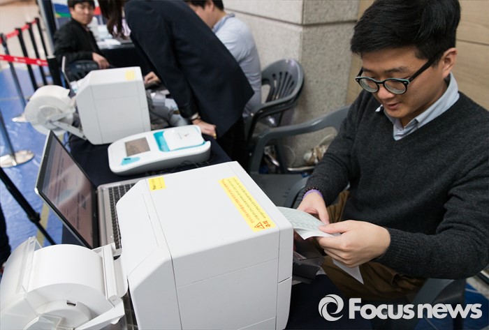 (인천공항=포커스뉴스) 제20대 국회의원 선거 사전투표를 하루 앞둔 7일 오후 인천국제공항 출국장에서 인천 선거관리위원회 관계자들이 사전투표소 설치 후 점검하고 있다.