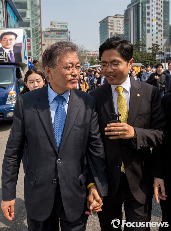 (인천=포커스뉴스) 문재인 더불어민주당 전 대표가 7일 오후 인천광역시 지하철1호선 주안역 남광장에서 열린 인천 지역 후보 합동유세를 마친 뒤 김광진 더불어민주당 의원과 대화를 나누고 있다.