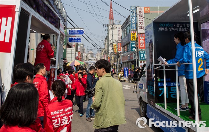 (서울=포커스뉴스) 7일 오후 서울 성북구 장위시장 앞에서 열린 김효재 새누리당 성북구을 후보 지원유세장 앞을 기동민 더불어민주당 유세차량이 지나가고 있다.