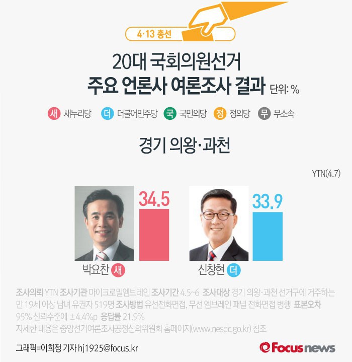 (서울=포커스뉴스) YTN이 마이크로밀엠브레인에 의뢰해 7일 발표한 경기 의왕·과천 여론조사 결과에 따르면 새누리당 박요찬 후보의 지지율은 34.5%, 더불어민주당 신창현 후보의 지지율은 33.9%로 나타났다.