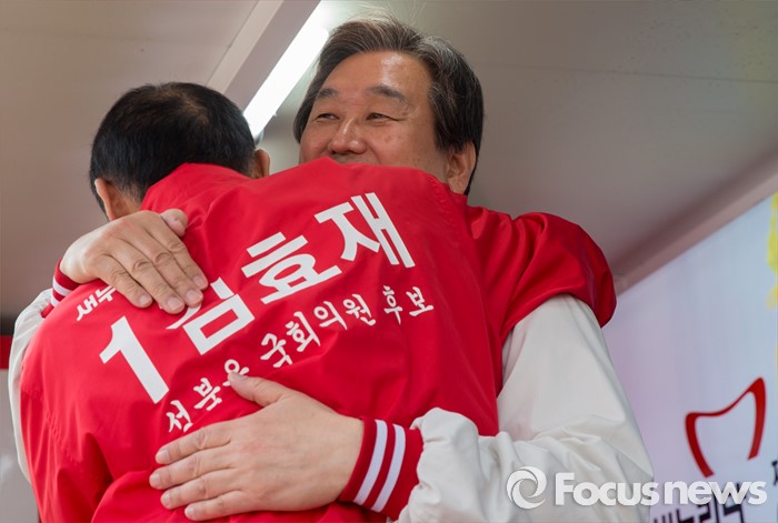 (서울=포커스뉴스) 7일 오후 서울 성북구 장위시장 앞에서 열린 김효재 새누리당 성북구을 후보 지원유세에 나선 김무성 대표가 김 후보와 포옹하고 있다.