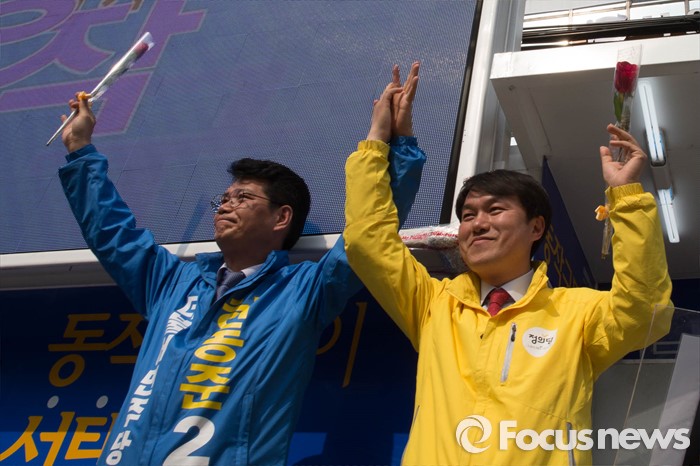 (서울=포커스뉴스) 20대 총선을 6일 앞둔 7일 오후 서울 동작구 남성역 골목시장 인근에서 허동준 더불어민주당 동작구을 후보와 김종철 정의당 후보와 후보 단일화에 합의하고 손을 들어올리고 있다.